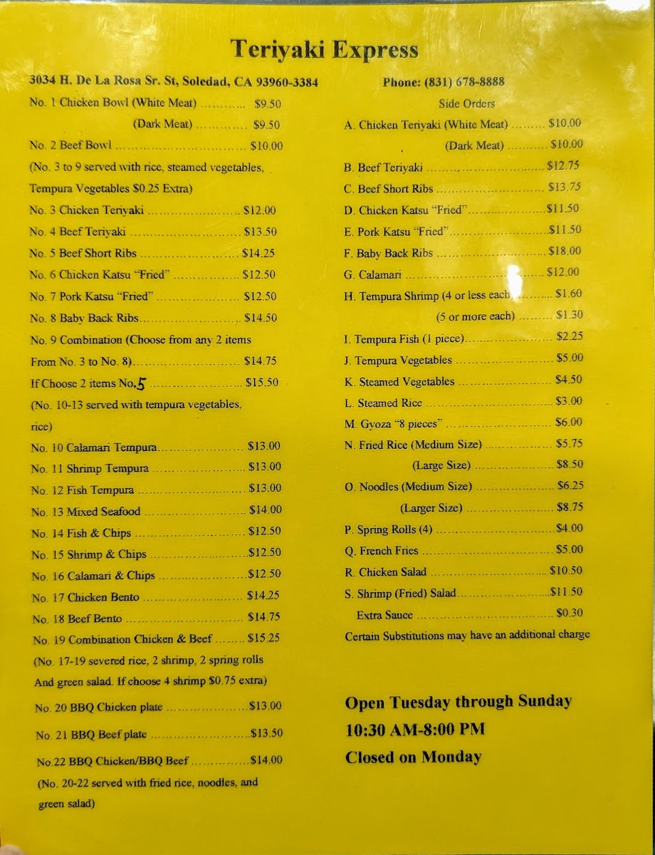 Teriyaki Express offers a straightforward menu centered on satisfying, approachable Japanese dishes. The selection leans into comforting, familiar flavors served in generous portions, making it an inviting choice for casual meals throughout the day.